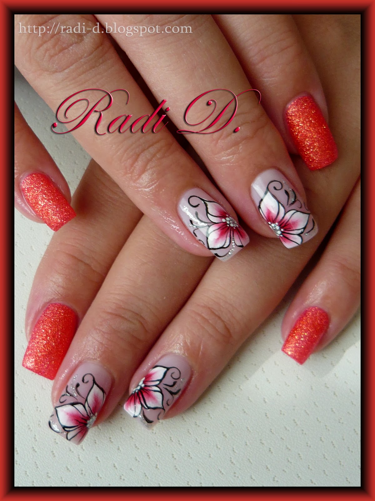 On the middle and index nails together with the thumb nails I painted one stroke flowers with acrylic paints.